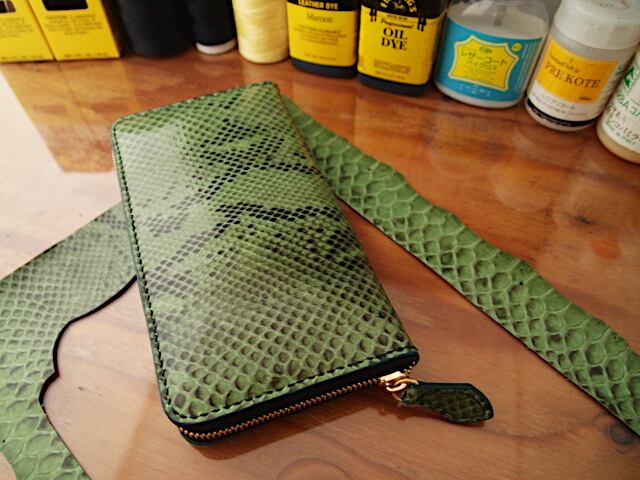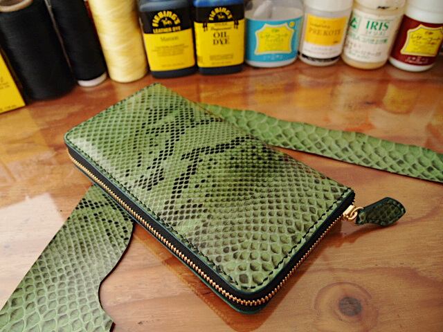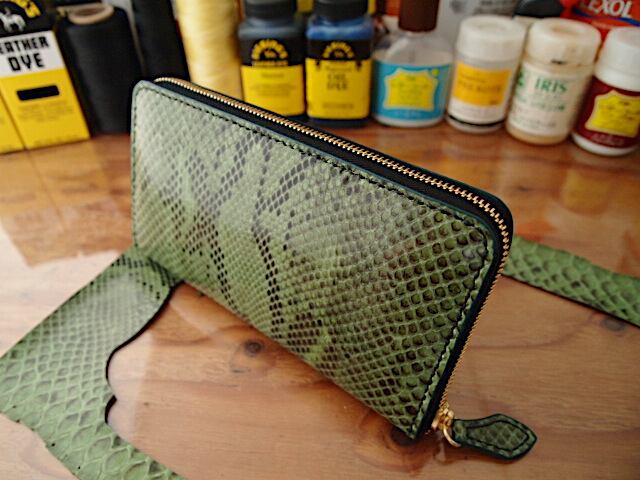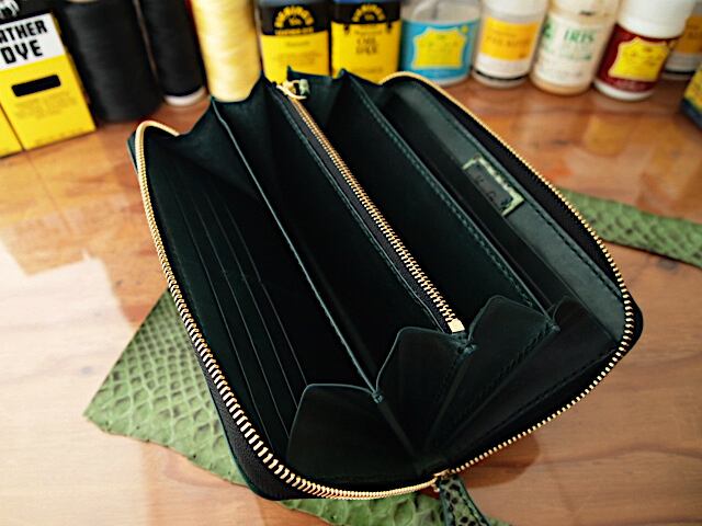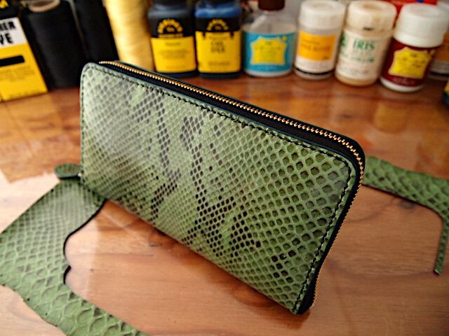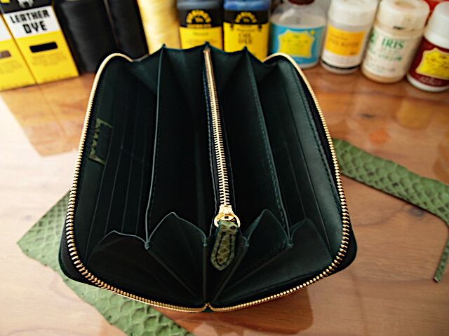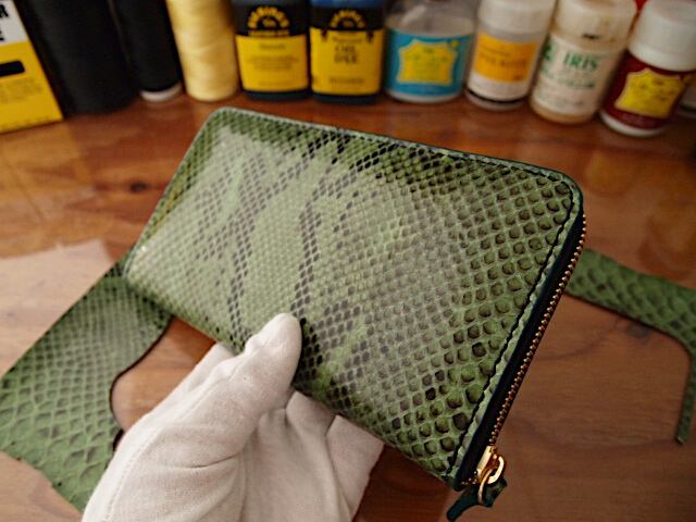 ダイヤモンドパイソンのモスグリーンカラーを使ったラウンドファスナーの長財布、内装にはヌメ革を使っています。こちらも時間経過とともに革が形となり柔らかみや色合いが変化していきます。