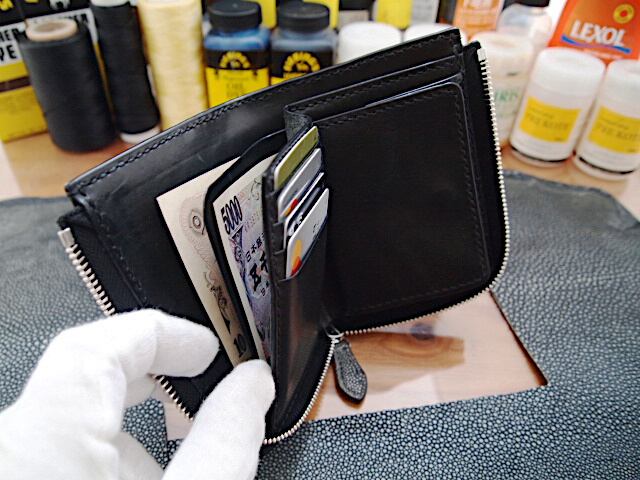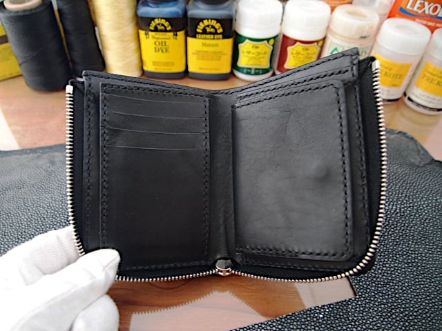 スティングレイの吟すりを使ったL字型のファスナーウォレット、 スティングレイの表面をフラットにする事によってでる強い光沢が大変印象強いです。内装は艶がよくでた発色の良い牛革薄く漉いて建て付けています。ポケットにしっかり収まるコンパクトな手縫いの財布、是非楽しんでお使い頂ければと思います。