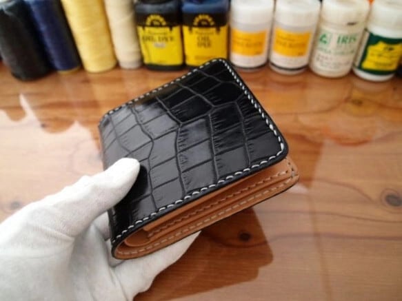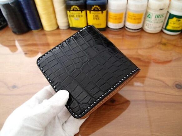 【オーダー】クロコダイルの本革で作る総手縫いの2つ折ショートウォレット財布黒ブラック艶有×ヌメ革