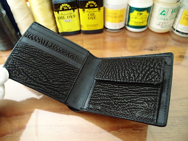 シャークレザーをミシンで縫い合わせた薄型のショートウォレット、サメ革の持つ革の柔らかさと表面にでた独特のラインが大変印象強く感じさせてくれています。